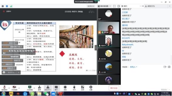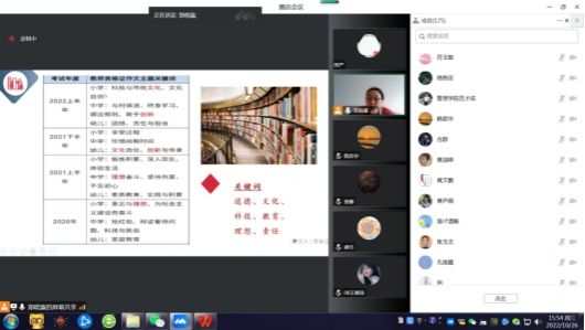 在活动中,陈晓凤老师与郑晓瀛老师结合多年的教学与教师资格证考试培训经验,分享了各自在相关领域内的详实研究成果。其中,陈晓凤老师详细梳理了考试的题目类型及占比,点出易错题、易拉开分数题目。同时,梳理了各个模块知识点的易考内容和关键人物事件,通过一些经典的例题具体分析了在考试时需要注意的地方和解读题目的思路;郑晓瀛老师以举一反三的策略,以议论文为例的行文五要素即引、议、提、联、结,结合大量实例案例、真题解析与细节分析,对学生在全国教师资格证考试科目《综合素质》中各个考点的得分与失分点展开了详细的解说,同时针对考试时间分配、作文规范、阅读技巧等考生关心的问题做了系统详实的讲解。两位老师鼓励同学们在有限的时间内,有重点的复习,静心备考,并希望大家都不辜负渴望为人师表的热情和信念。