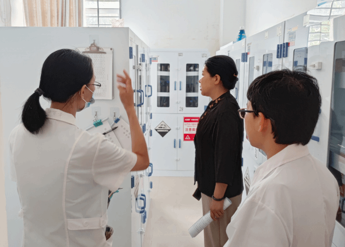 检查组实地对理学院的教科研实验室、危化品专库、药品储存室以及废弃物贮存间等场所进行全面检查,重点排查危化品和易燃易爆炸易腐蚀物品的采购、存储、使用、废弃处置的风险隐患,排查辐射、生物、机械、特种设备等实验设施、设备与用品等重大危险源的管理情况。在检查过程中对发现的问题做了详实记录,并提出整改措施,现场与相关职能部门进行了沟通协调,对废弃物贮存间存在的隐患问题立行立改。