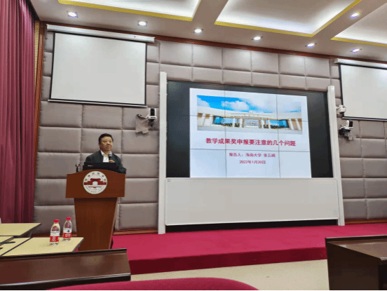 为了进一步做好122cc太阳成集团优秀教学成果的凝练、总结和教学成果奖申报工作,不断提高教学成果的建设水平,122cc太阳成集团于2022年1月20日在桂林洋校区实验楼D102组织教学成果申报培训会。本次培训会邀请海南大学马克思主义学院院长张云阁教授为主讲嘉宾,韩君华副校长主持,学院领导及教师共七十余人参加培训。